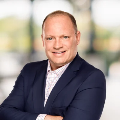 A man with short brown hair, wearing a light plaid blazer and light-colored shirt, smiles in front of a blurred office background.