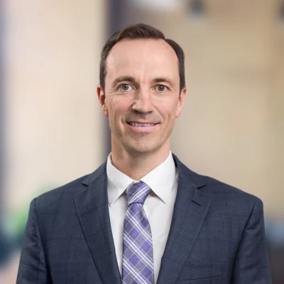 Man in a gray suit and light blue tie smiling at the camera, with a blurred office background.
